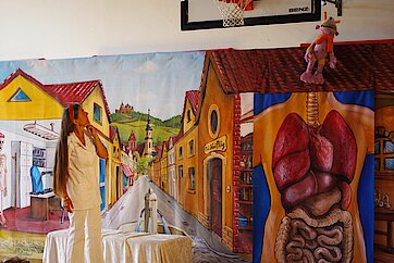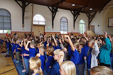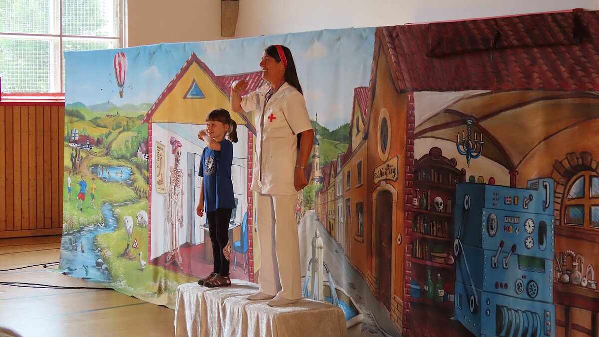 Die Kinder im Publikum müssen viele Aufgaben bewältigen und sich dabei bewegen, singen und Sport treiben und so schlagen sie schließlich den fiesen Bazillus in die Flucht.