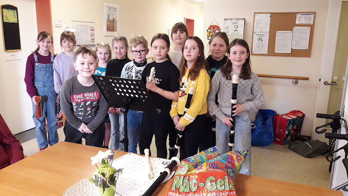 Mittwochs (1-2x im Monat) war unser Tag, um mit Frau Günther am Nachmittag ins Pflegeheim zu gehen. Mit Flöten, Gitarre, Notenständer und Taschen voller Spiele besuchten wir jeweils einen anderen Wohnbereich. Wir begrüßten die Bewohnerinnen und Bewohner mit Musikstücken auf der Flöte/Gitarre und mit Liedern, die zum Mitsingen und Klatschen motivierten. Es war immer aufregend, mit den Bewohnerinnen und Bewohnern in Kontakt zu kommen, z.B. beim Spielen oder Malen. So gefiel dem Einen die Igelballmassage, dem Anderen das Vorlesen oder das Schachspiel. So mancher Erzählung von Früher konnten wir lauschen.