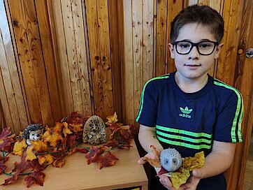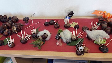 Gesammeltes Naturmaterial, Kork, Papier, Wolle oder auch Ton inspirierten uns zu vielseitigem Basteln, welches ab und zu den Unterricht auflockerte. So wurden zum Beispiel aus Kastanien lustige Igel oder andere Gesellen.