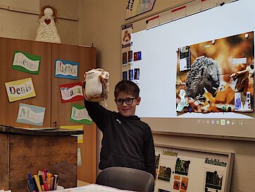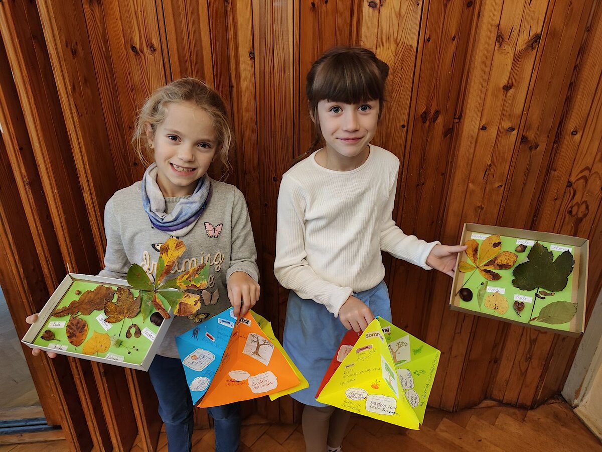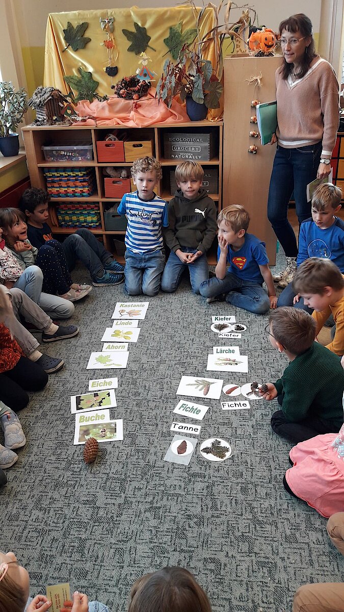 Beim Unterrichtsgang in unsere nähere Umgebung sammelten wir Blätter und Früchte unserer heimischen Laubbäume. Daraus entstand ein toller Wissensspeicher im Schuhkarton. Einige Schüler und Schülerinnen ergänzten unseren Lernstoff mit Vorträgen u.a. über die Bäume oder den Igel. Gemeinsame Übungen mit wunderschönem Anschauungsmaterial vertieften unser Wissen. Mit einem Quadrama, welches wir zu den Jahreszeiten anfertigten, verdeutlichten wir sehr detailliert all das Gelernte.