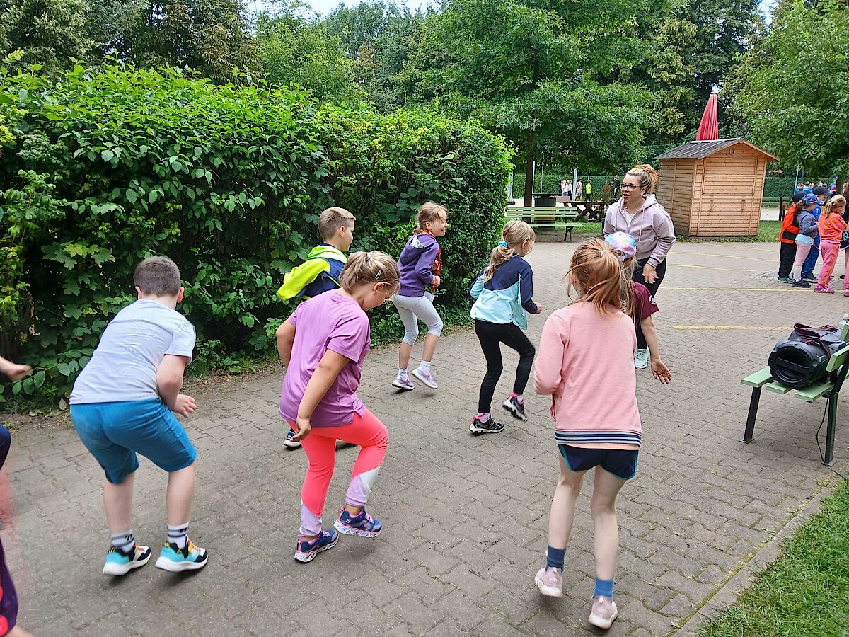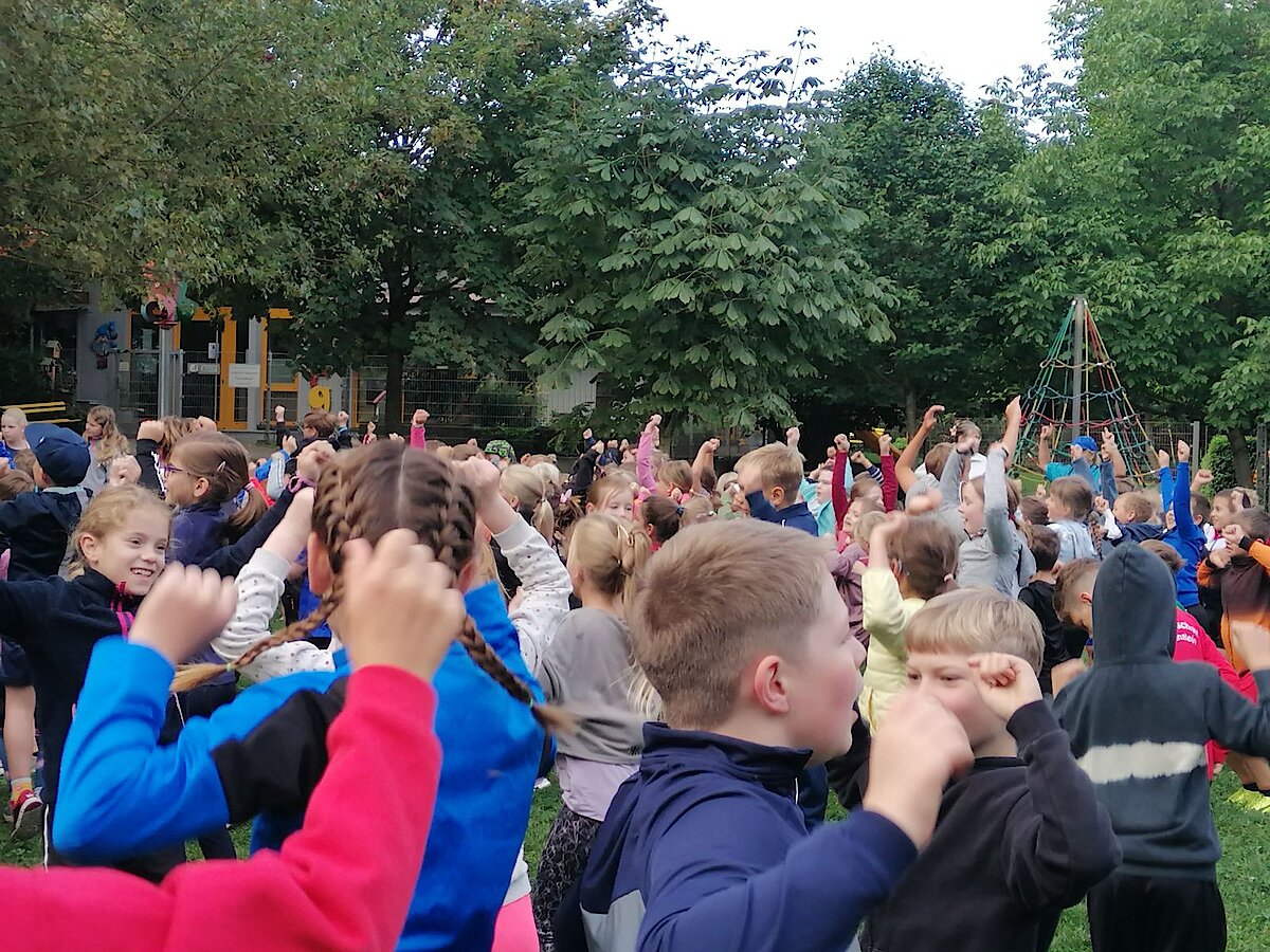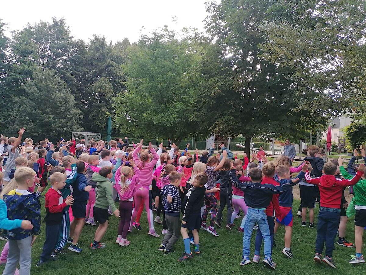 Mit einer Woche Verspätung starteten wir auch in sportlicher Hinsicht in das neue Schuljahr. Aufgrund der hohen Temperaturen in der ersten Schulwoche verschoben wir das Sportfest um eine Woche. Am Freitag, dem 22.08. traf sich die gesamte Schule pünktlich um 7.45 Uhr zur gemeinsamen Erwärmung auf dem Sportplatz. Einige Schülerinnen und Schüler durften die „Vorturner“ sein und jeweils eine Übung zeigen, die dann alle im Takt der Musik mitturnten.