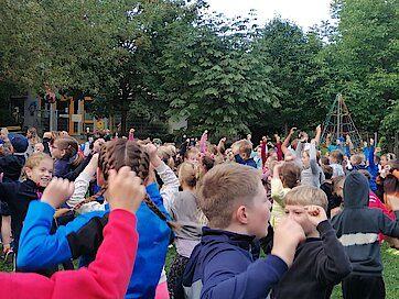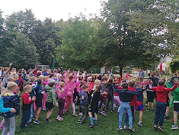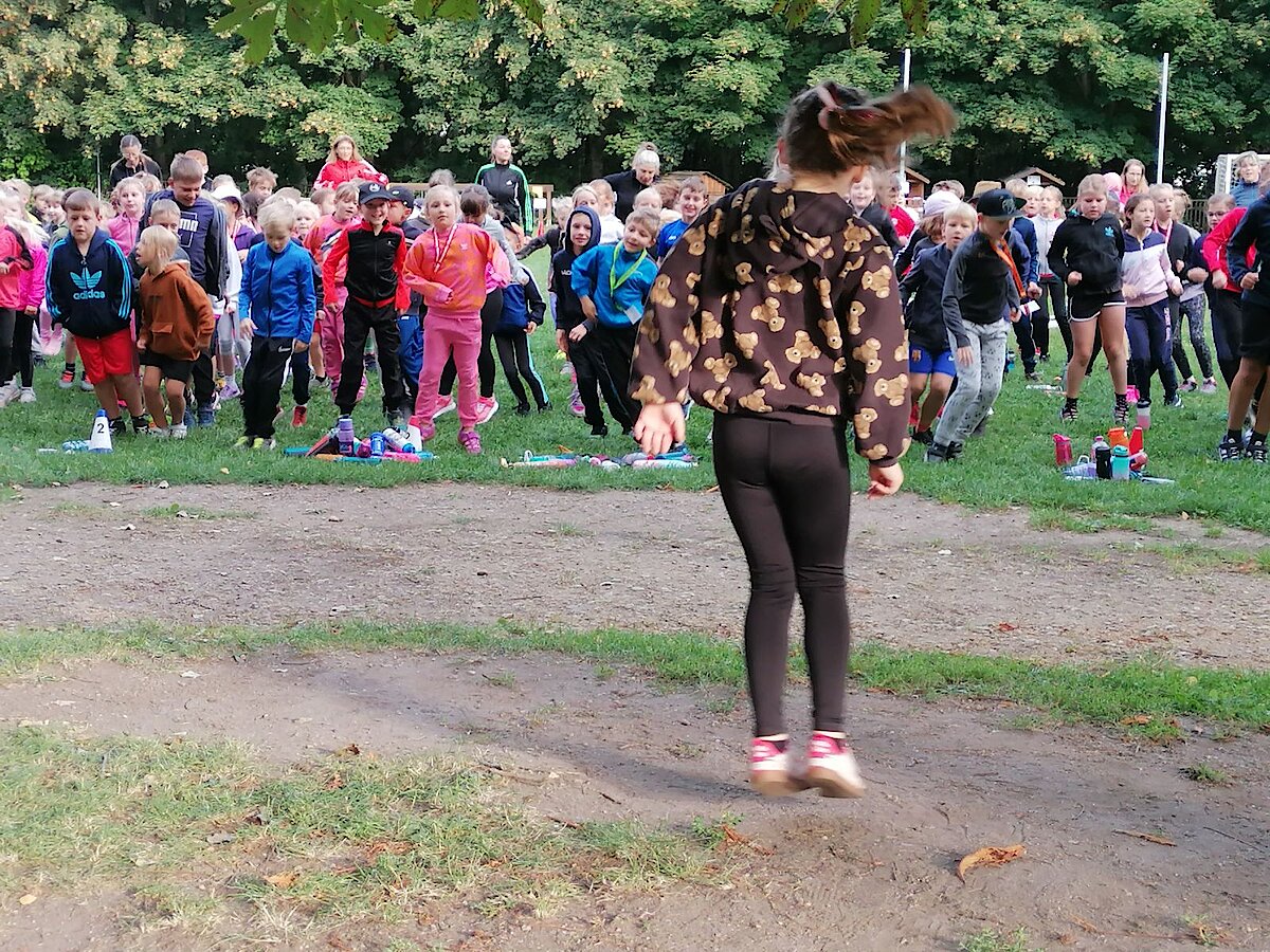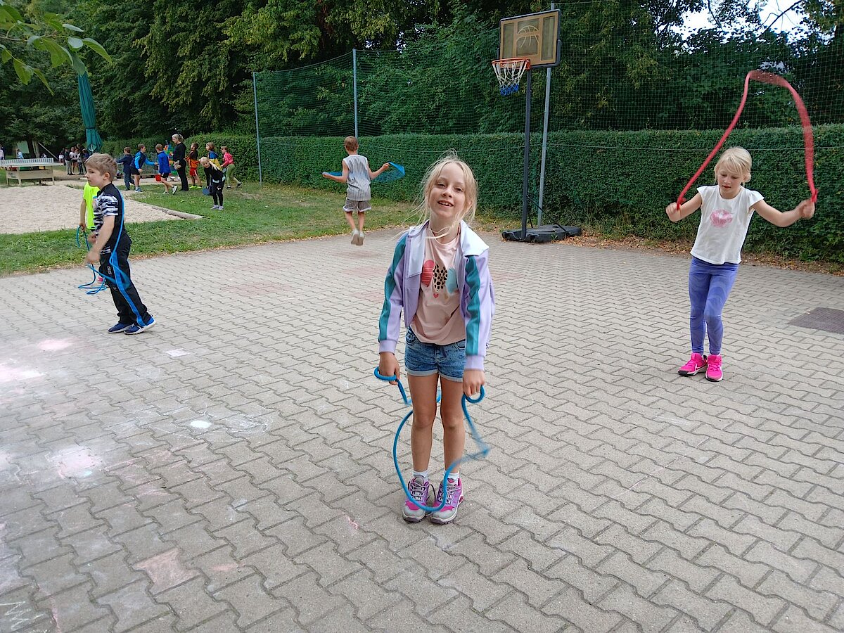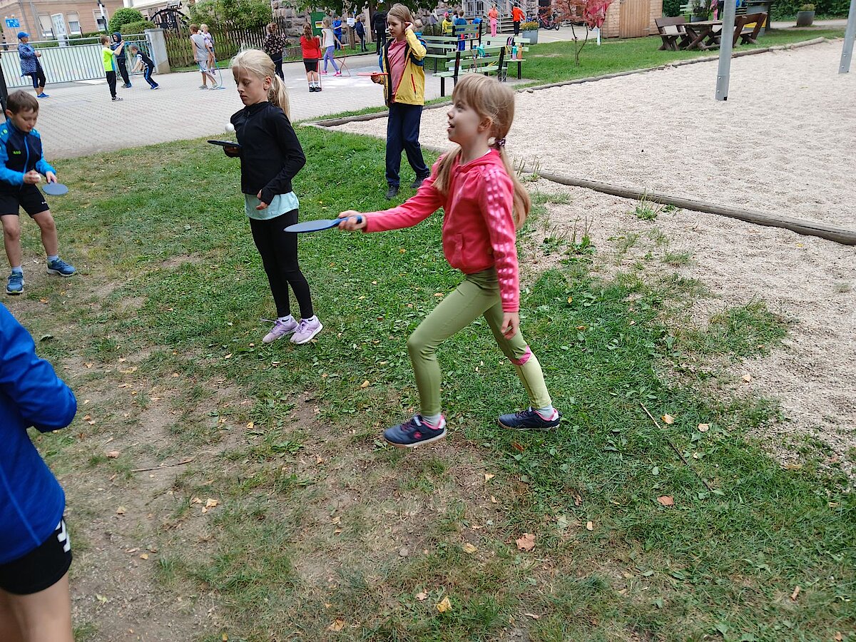 Mit einer Woche Verspätung starteten wir auch in sportlicher Hinsicht in das neue Schuljahr. Aufgrund der hohen Temperaturen in der ersten Schulwoche verschoben wir das Sportfest um eine Woche. Am Freitag, dem 22.08. traf sich die gesamte Schule pünktlich um 7.45 Uhr zur gemeinsamen Erwärmung auf dem Sportplatz. Einige Schülerinnen und Schüler durften die „Vorturner“ sein und jeweils eine Übung zeigen, die dann alle im Takt der Musik mitturnten.